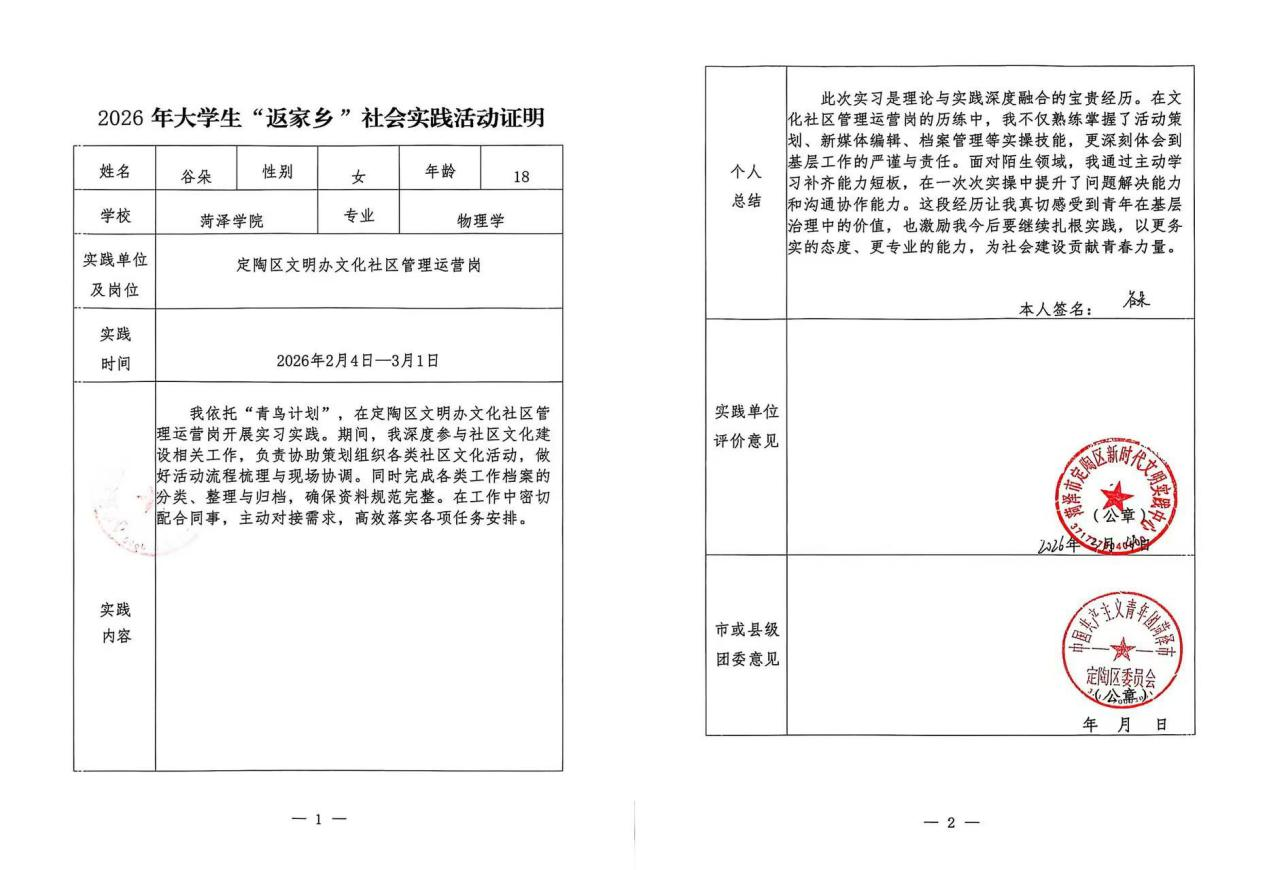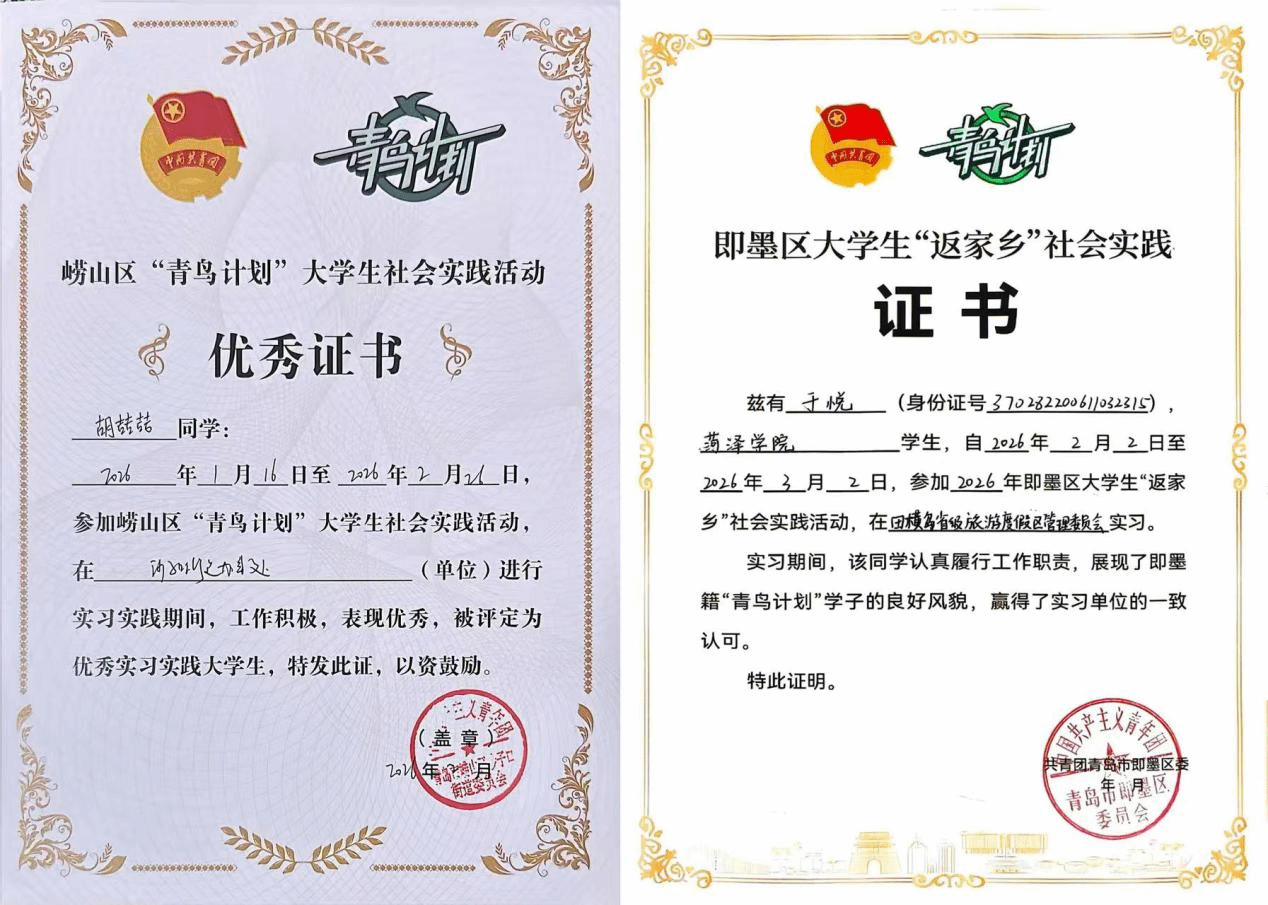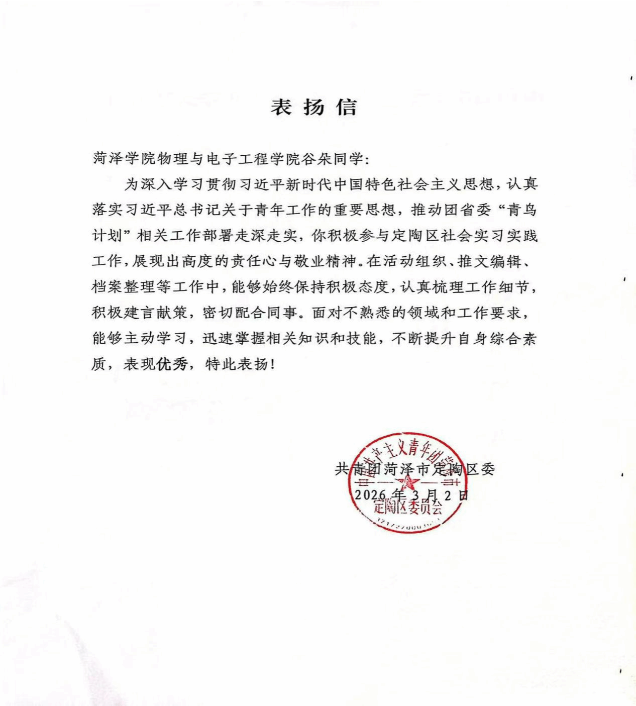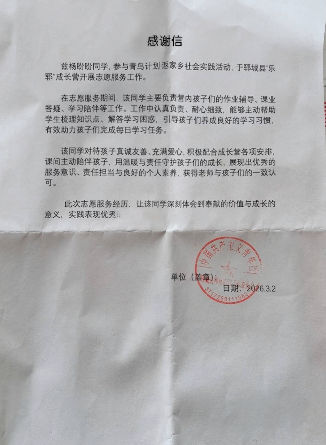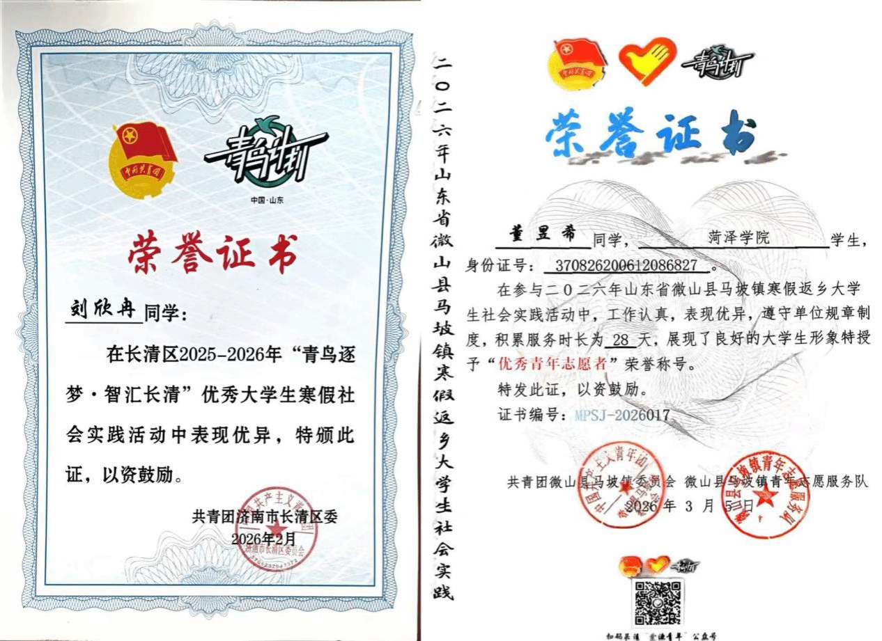 实践期间,qy球友会,千亿球友会学子怀揣着“热爱家乡、回馈家乡、投身家乡”的理想信念,积极投身于“青鸟计划”社会实践活动。其中,2025级物理学二班谷朵荣获表扬信;2025级物理学二班杨盼盼荣获感谢信;2025级物理学一班赵佳一、赵若暄,2025级物理学二班马文雅、董昱希,2024级物理学一班徐祺祺,2025级应用电子技术胡喆喆,2025级电子信息科学与技术二班于悦,2024级电气自动化技术刘欣冉荣获荣誉证书;2023级物理学二班郭本豪,2025级物理学二班王佳怡、谷朵、马文雅,2025级物理学一班李艺辉,2025级电子信息科学与技术二班于悦荣获实践活动证明。